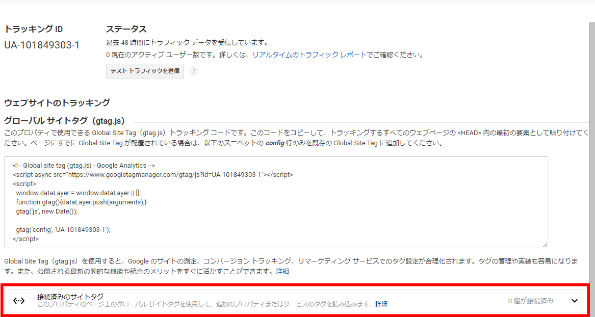 3.[グローバル サイトタグ(gtag.js)] の下の [接続済みのサイトタグ] をクリックします。