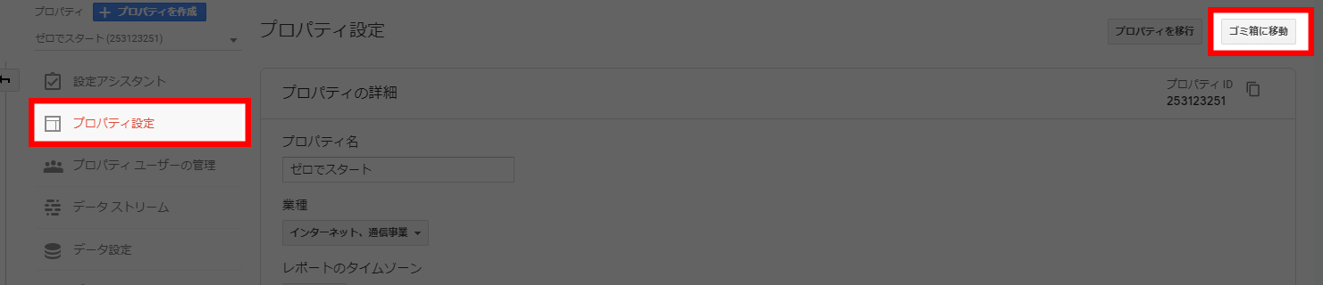 そして再度GA4のプロパティを開いて、さっきの手順でプロパティ設定→ゴミ箱に移動すると