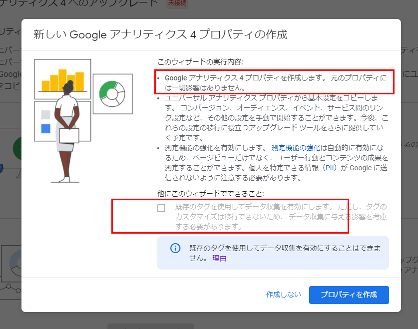 「Google アナリティクス 4 プロパティを作成します。 元のプロパティには一切影響はありません。」と書いてますね。安心。