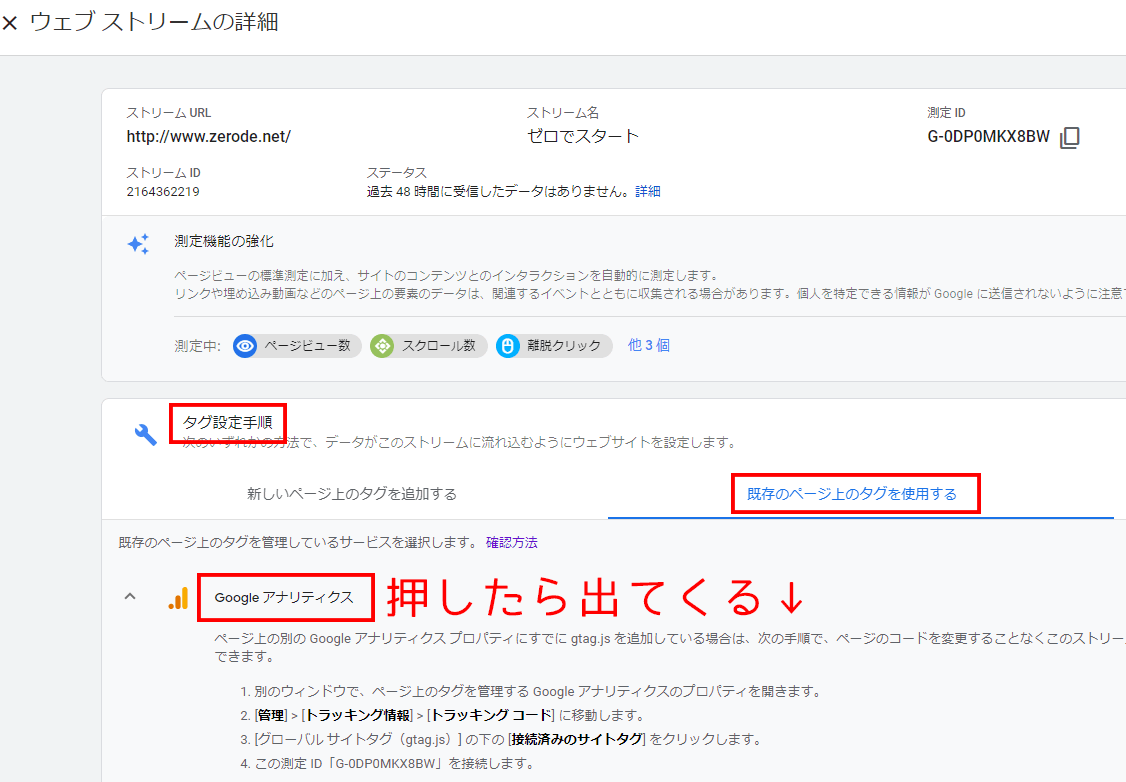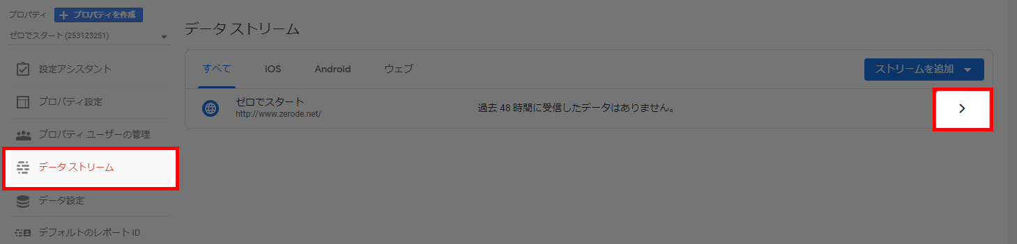 データストリームから三角を押して「ウェブ ストリームの詳細」に行き、
